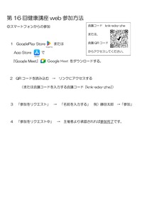 この度、健康講座を開催致します。webでのご参加も可能となっております。講座の詳細とweb参加の方法(当日の操作)については下記の画像をタップしてご覧ください。web参加用URL (当日の13時30分より開場します。事前にGoogle Meet のアプリのダウンロードが必要です)